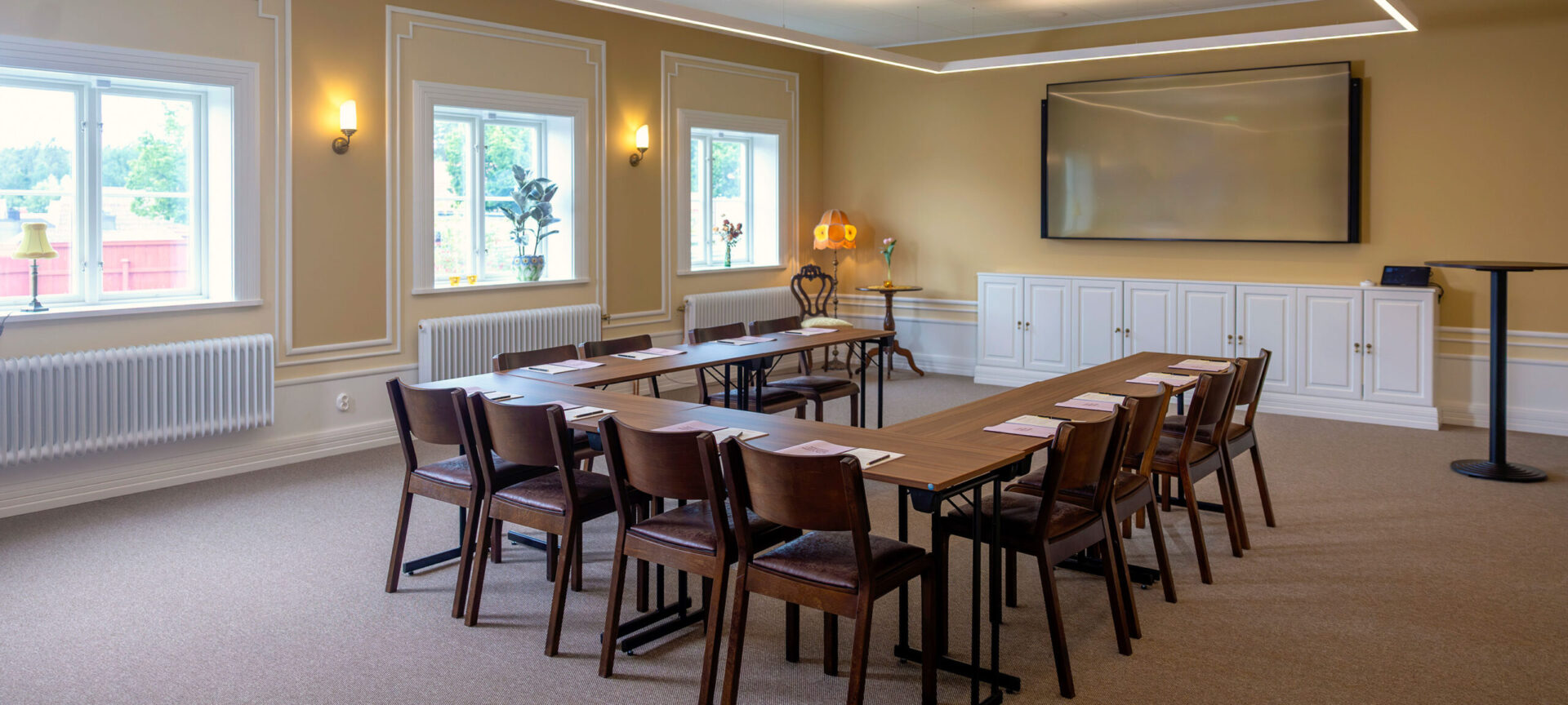 En mellanstor konferenslokal som passar för möten, utbildningar och presentationer. Lokalen kan möbleras efter behov och är ett bra val när ni vill kombinera tydlig funktion med en lugn och inspirerande miljö.